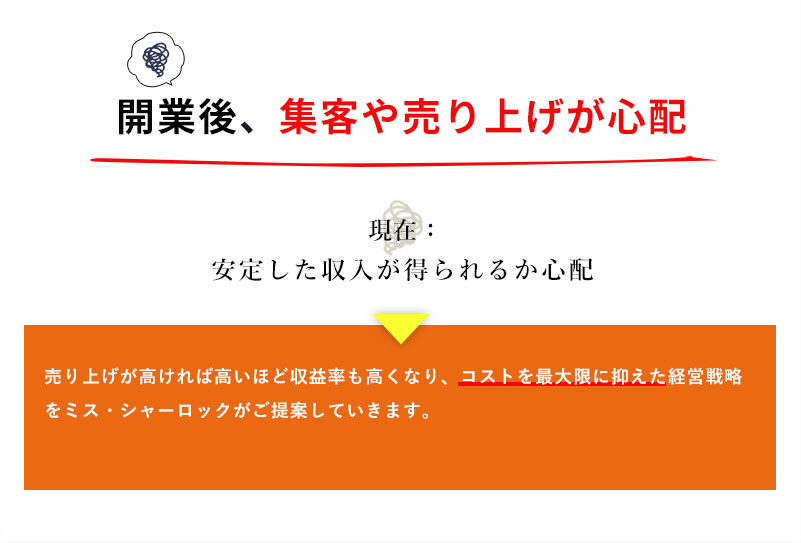 安定した収入が得られるか心配売り上げが高ければ高いほど収益率も高くなり、コストを最大限に抑えた経営戦略をミス・シャーロックがご提案していきます。