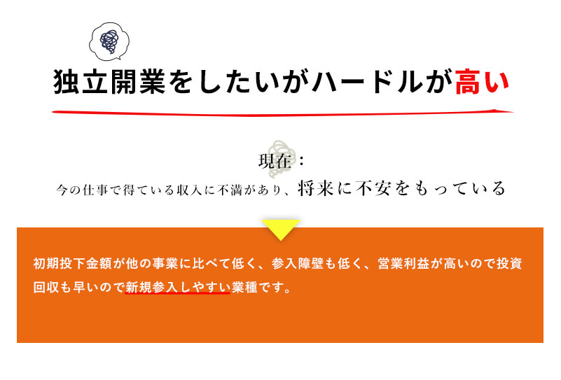 将来に不安をもっている初期投下金額が他の事業に比べて低く、参入障壁も低く、営業利益が高いので投資回収も早いので新規参入しやすい業種です。