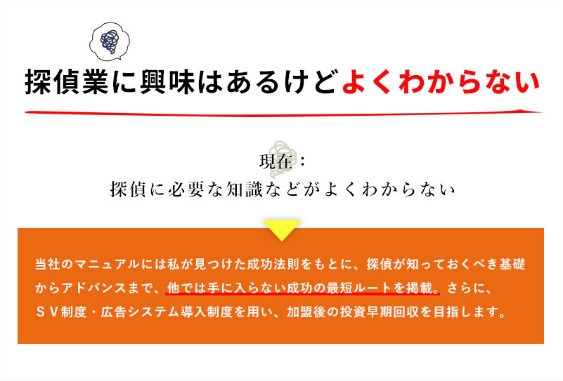 探偵が知っておくべき基礎からアドバンスまで、他では手に入らない成功の最短ルートを掲載。さらに、SV制度・広告システム導入制度を用い、加盟後の投資早期回収を目指します。