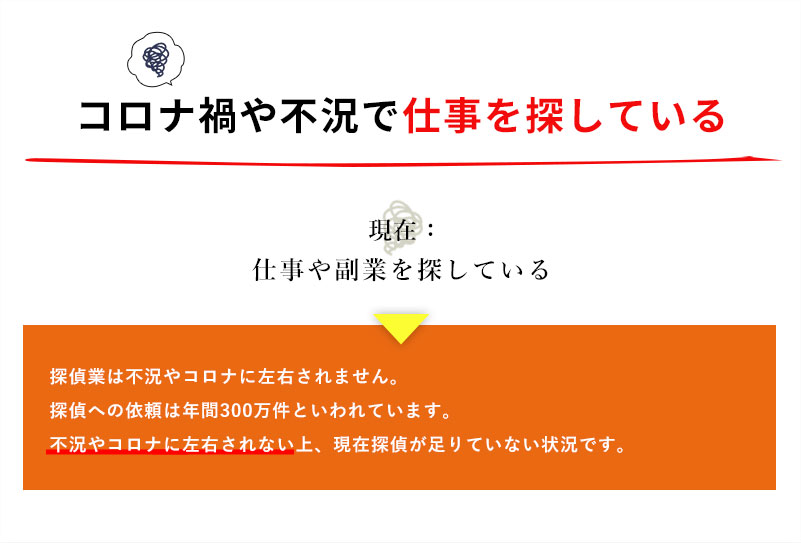 仕事や副業を探している探偵業は不況やコロナに左右されません。